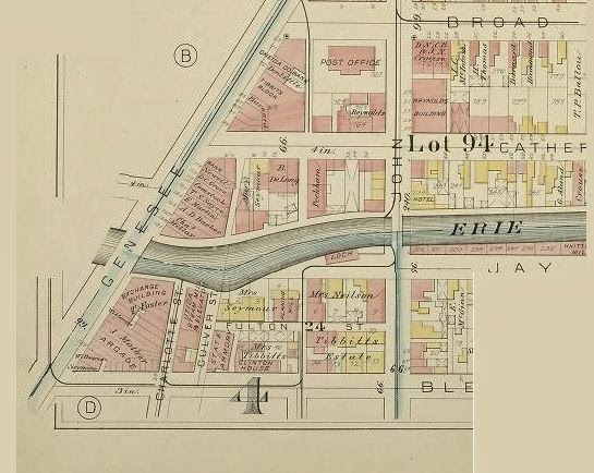 Above is the 1883 Utica Map showing the canal crossing Genesee Street.  Bleecker Street is at the bottom of the map segment, Broad Street at the top.